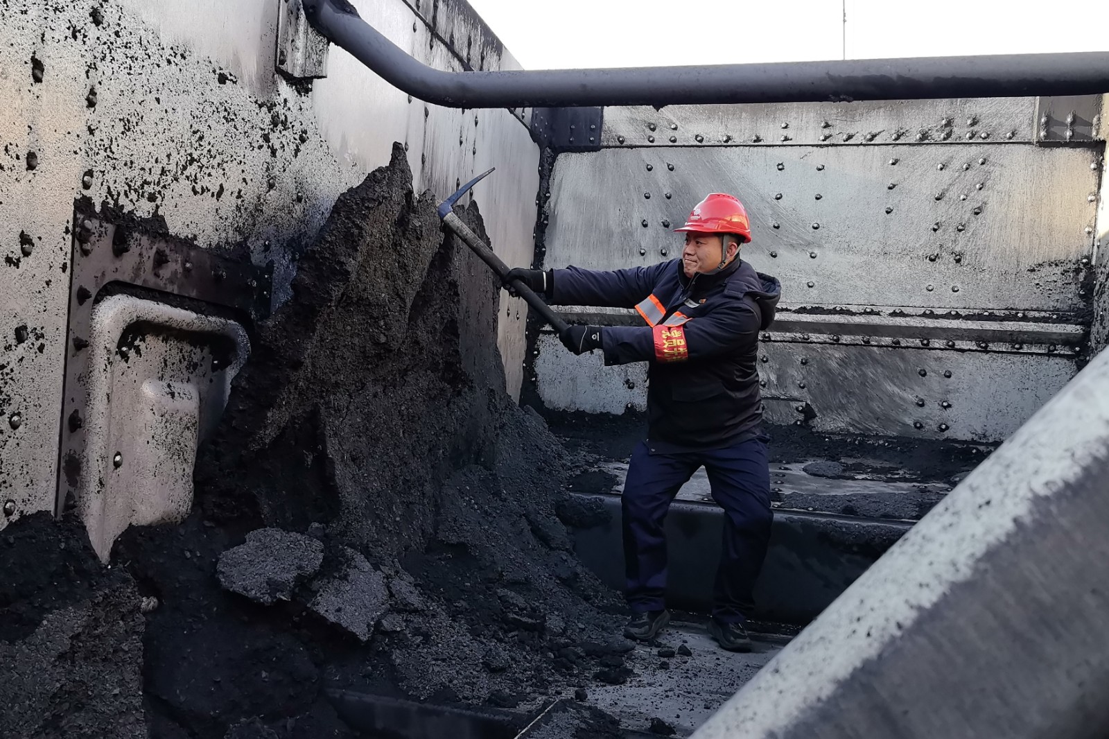 清車管理人員對車廂內(nèi)壁的凍煤進行清理。