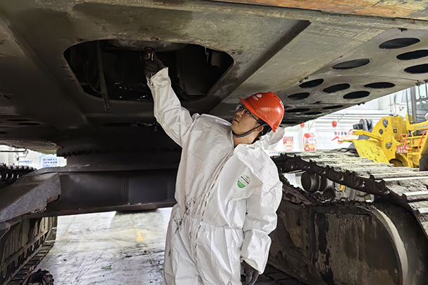 職工檢查液壓鏟發(fā)動(dòng)機(jī)漏油故障。