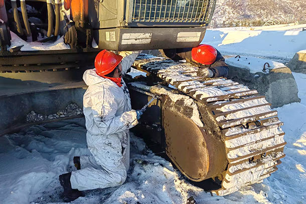雪一直下,紛紛揚(yáng)揚(yáng)。下午5點(diǎn),伴著暮色降臨,3號(hào)TR100運(yùn)輸卡車(chē)后輪盤(pán)制動(dòng)出現(xiàn)漏油故障,緊急時(shí)刻,郜普浩和兄弟們驅(qū)車(chē)前往現(xiàn)場(chǎng)搶修。由于維修盤(pán)制動(dòng)是系統(tǒng)性檢修,需要拆解后輪胎、放油、卸掉制動(dòng)壓力,拆卸盤(pán)制動(dòng)組件和輪邊減速器組件,排除故障點(diǎn)后,再進(jìn)行回裝。夜幕中,他們一個(gè)一個(gè)零件地拆卸,一個(gè)一個(gè)部件地安裝,一個(gè)個(gè)忙碌的身影在夜晚燈光的映襯下顯得高大起來(lái)。