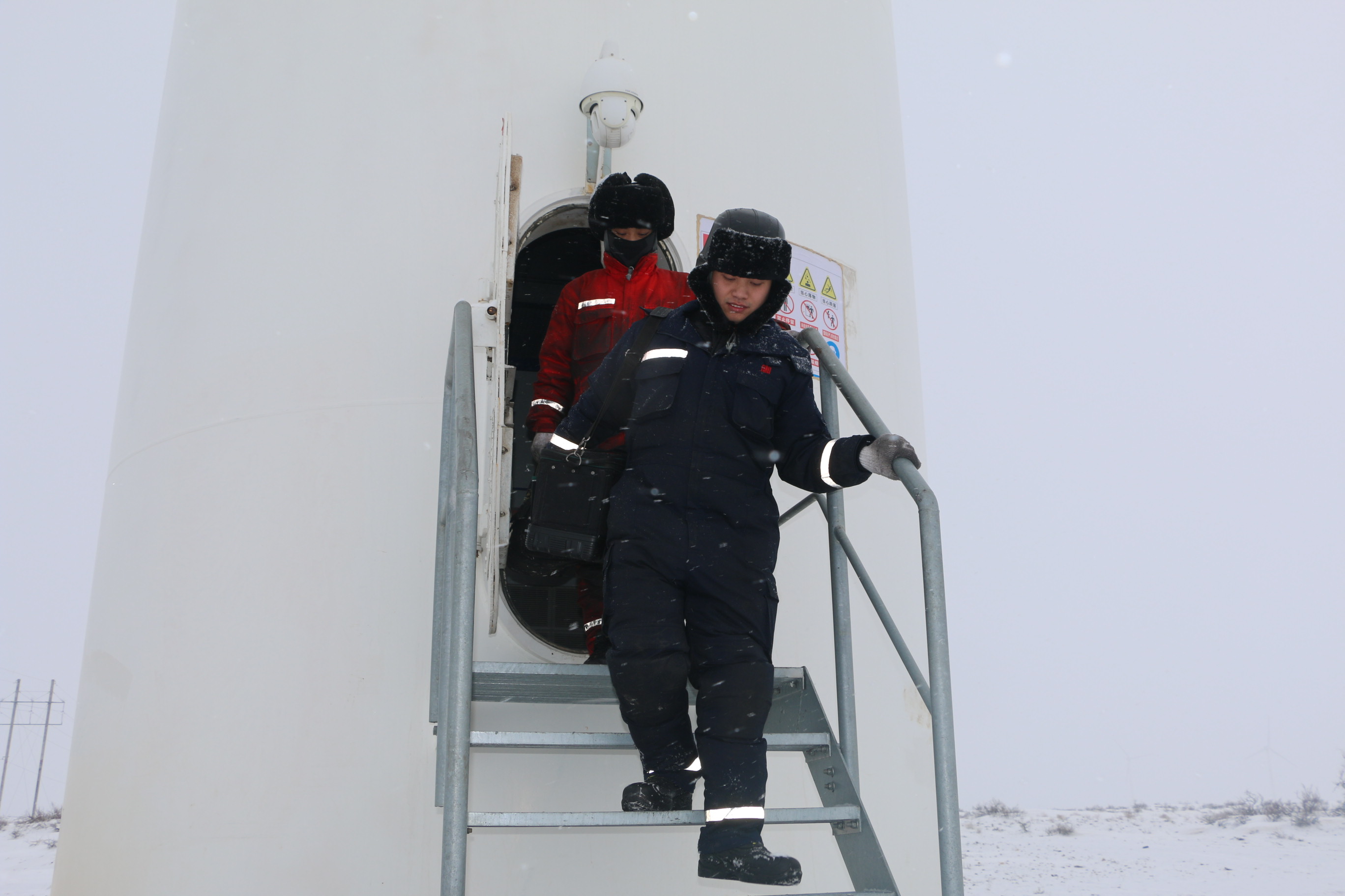“用望遠鏡看一下葉片,仔細觀察葉片表面和連接部位沒問題后,再仔細檢查下箱變……”,交接班結(jié)束后,運維人員便身著厚重的防寒服、頭戴冬季安全帽,全副武裝后,踏上了全面特巡的“旅途”中。