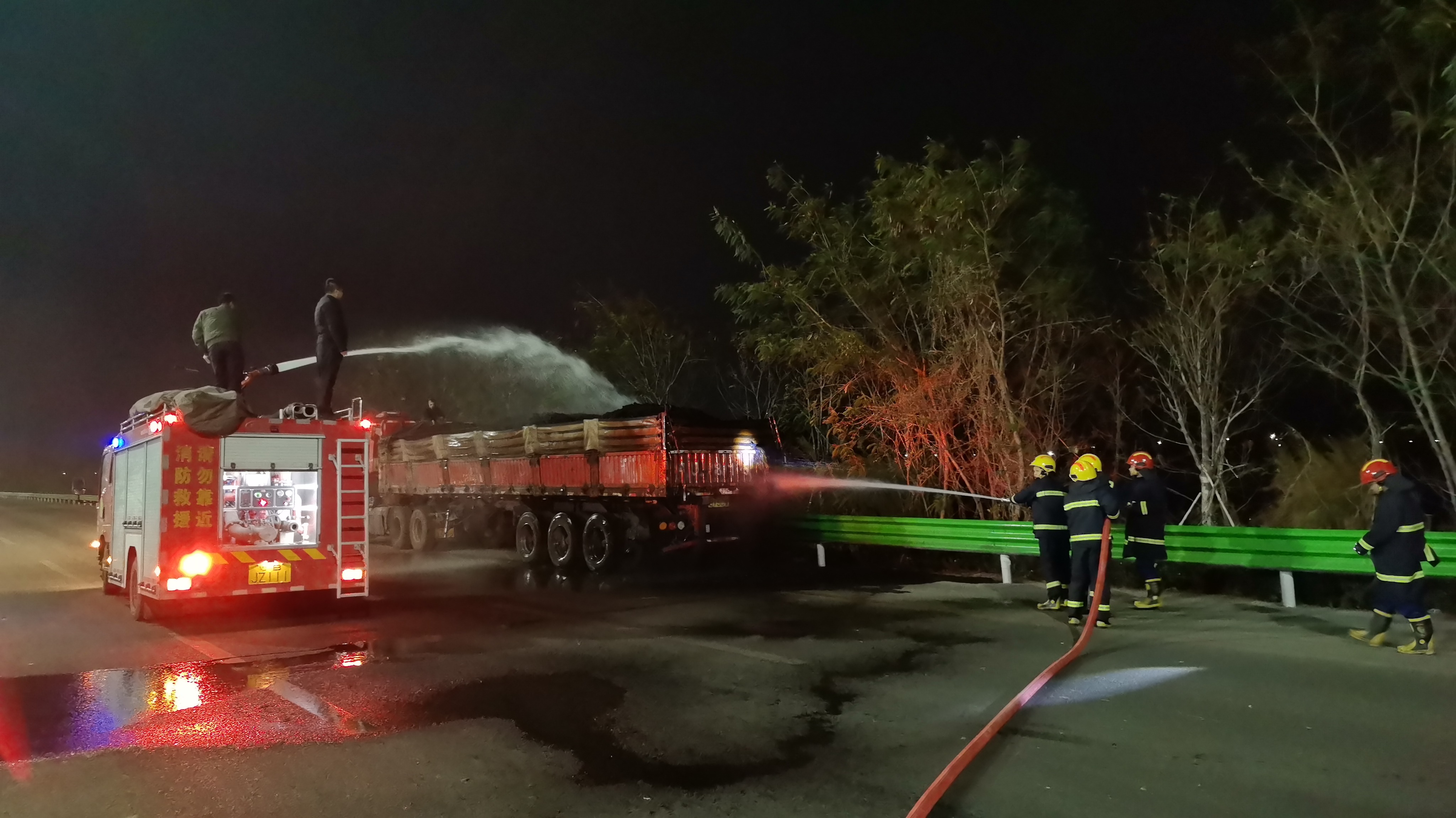當(dāng)晚9時(shí)45分,嚴(yán)佳豪駕車(chē)途經(jīng)進(jìn)港公路時(shí),敏銳捕捉到異?!胺酵?康闹匦拓涇?chē)尾部躥出火星,濃煙正從篷布縫隙滲出。出于職業(yè)敏感,他立即停車(chē)查看,發(fā)現(xiàn)竟是煤炭自燃,而司機(jī)因過(guò)度勞累,在駕駛座上睡得正沉?!爸鹆?!著火了!”嚴(yán)佳豪猛拍車(chē)門(mén)。司機(jī)驚醒后,急忙撥打了119報(bào)警電話。