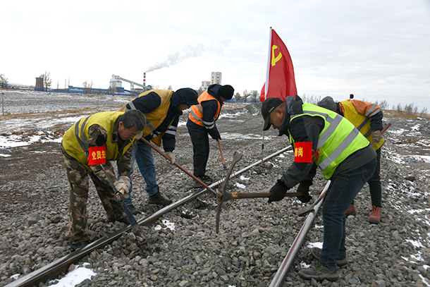 黨員先鋒崗對鐵路線路填充砟石。