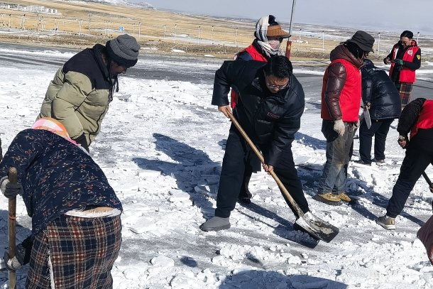 普布多吉帶領(lǐng)黨員志愿者清理轄區(qū)道路結(jié)冰路面。