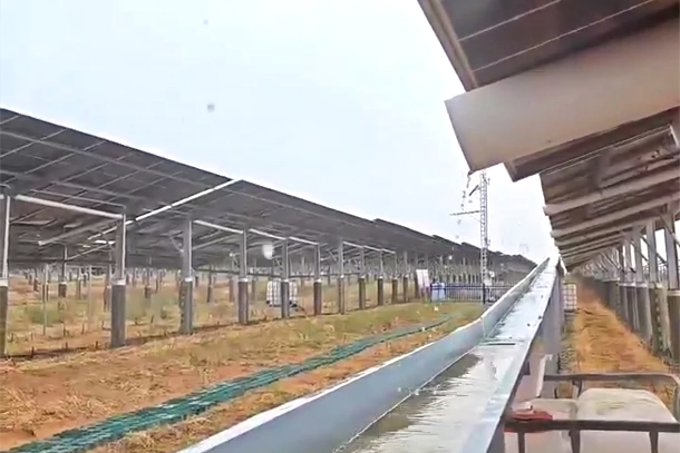 視頻畫面里,貴如油的春雨從光伏板流下,順著整齊排列的集水槽全部匯入儲水罐。有了這套集水裝置,光伏板下剛抽了新芽的“苗苗”們不僅能得到這場雨水的滋養(yǎng),未來一段時間還有儲備水可供使用。真讓人高興??!楊奕穎對項目的信心又增加了幾分。