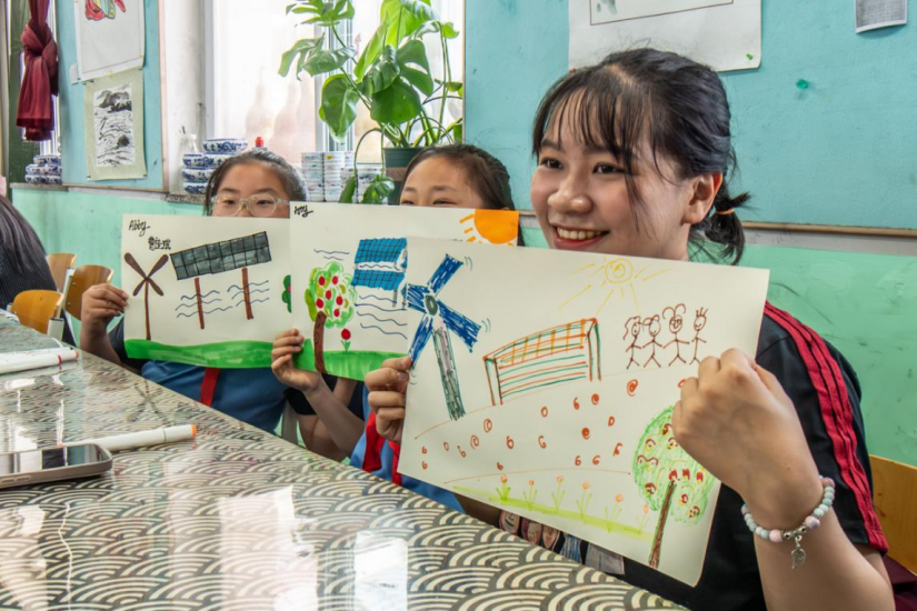 在分組進(jìn)行新能源主題藝術(shù)作品創(chuàng)作環(huán)節(jié),因?yàn)榧艏埈h(huán)節(jié)的默契配合,小明選擇和王子分到了一組,他們一同選定了風(fēng)機(jī)運(yùn)轉(zhuǎn)在山水間的主題,正在興致勃勃地開(kāi)始創(chuàng)作?!拔襾?lái)畫(huà)風(fēng)機(jī)!”“那我畫(huà)后面的青山吧,山上面再畫(huà)幾筆河流?!绷攘葞坠P,孩子們眼中的中國(guó)新能源綠色發(fā)展前景躍于眼前,清潔能源的種子也在他們心中生根、發(fā)芽……