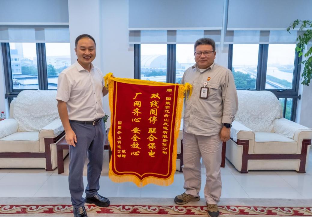 秀山舞海風(fēng),翠鳥鳴云間。6月11日,遠(yuǎn)望舟山群島這早已熟于內(nèi)心的美景,國家能源集團(tuán)浙江公司舟山電廠的員工們又是一份別樣的心情。喜悅和欣慰,自豪而振奮,每個員工的臉龐上都洋溢著燦爛的笑容。經(jīng)歷了二十個日夜里“孤島”堅守,打贏了一場“只許勝不許敗”的戰(zhàn)役,讓國能人的赤忱和擔(dān)當(dāng)閃耀于千島之鄉(xiāng)。就在這一天,國網(wǎng)舟山供電公司專程來到舟山電廠,將一面閃爍著“雙線同停 聯(lián)合保電,廠網(wǎng)齊心 安全放心”十六個鎏金大字的錦旗贈予該廠,對舟山電廠在5月19日至6月7日之間“孤島”保電的壯舉表達(dá)欽佩和感謝。這感人的場景,不禁喚起了員工們的回憶,那一幕幕感人肺腑的場景又在腦海中徘徊。