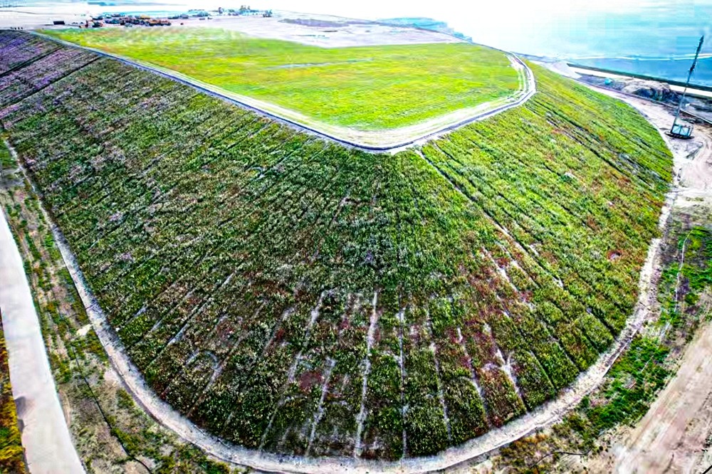 走入國家能源集團烏海能源蘇海圖煤礦東排土場的1280東邊坡,夏季熱烈的風(fēng)吹過,坡上綠油油的芨芨草隨風(fēng)搖擺,令人感覺舒爽愜意。誰能想到,這片“會呼吸”的土地下,埋著1.2萬方從黃河撈起的“泥疙瘩”——這些曾被視作“廢棄物”的黃河底泥,如今正通過一場生態(tài)實驗,在沙漠邊緣演化成“生態(tài)土”,孕育出“新生命”。