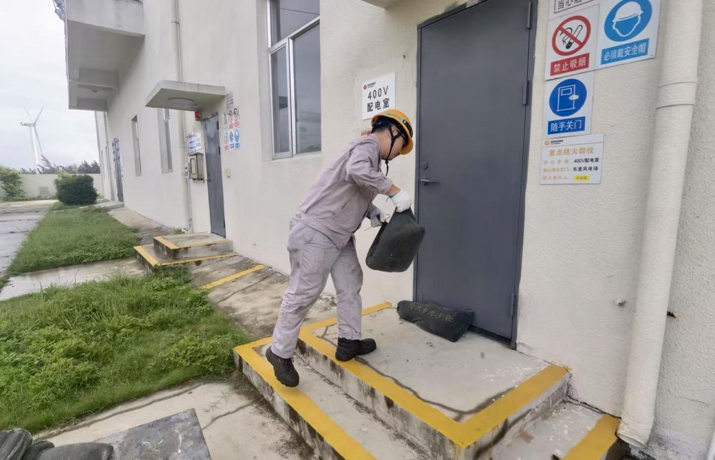 臺風(fēng)登陸前,他們啟動“備戰(zhàn)—響應(yīng)—搶修”全鏈條防御機制。配電室、主控樓門前上百個防汛沙袋堆砌成一堵堵“防御墻”,繼保室與主控室玻璃映著雙層膠帶疊加的“米字形”,室外端子箱包裹上一層層的防水薄膜,用工業(yè)扎帶捆綁得嚴(yán)嚴(yán)實實,抗風(fēng)雨能力全面升級,構(gòu)筑起三重物理防線。