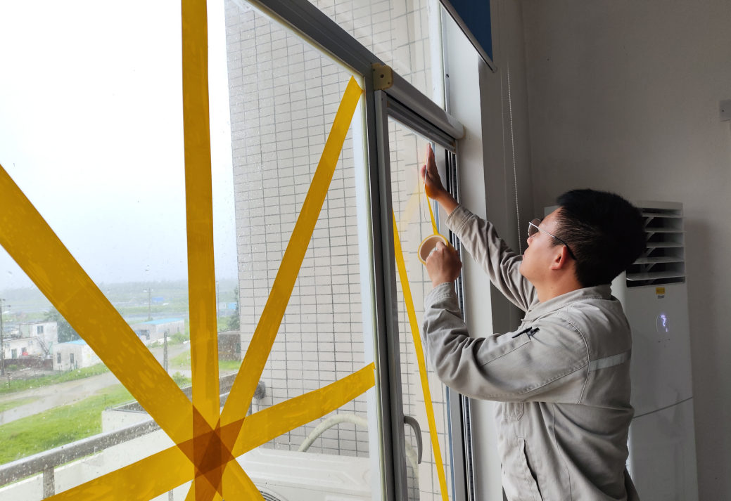 運維人員在主控樓玻璃上疊加粘貼膠帶,形成米字形加固結(jié)構(gòu)。