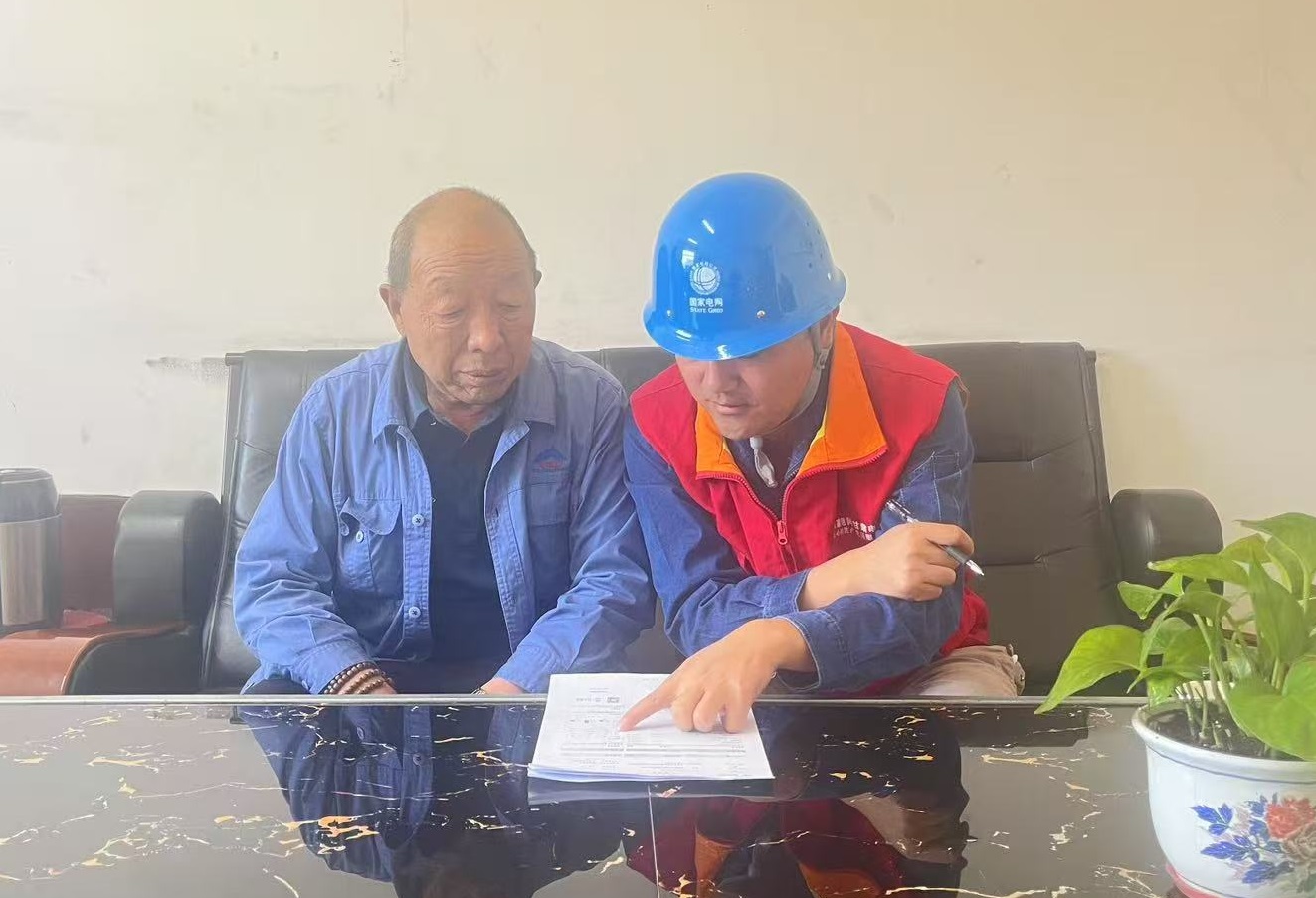 國網(wǎng)皋蘭縣供電公司客戶經(jīng)理李喜慶向劉明珍講解能效優(yōu)化措施。
