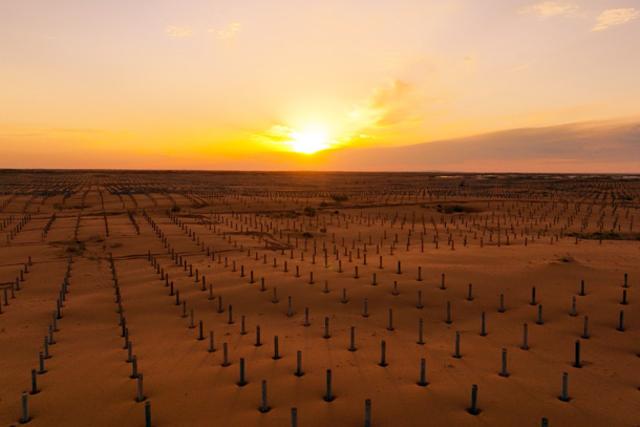 今日長纓在手,定能縛住“沙”龍。新一代沙漠“鎖邊師”用汗水與智慧,在風沙線上筑起了堅不可摧的屏障——不僅鎖住了流沙,更“鎖住”了陽光,“鎖住”了人與自然和諧共生的愿景。此刻,他們的腳步并未停歇,正向著沙漠更深處挺進。