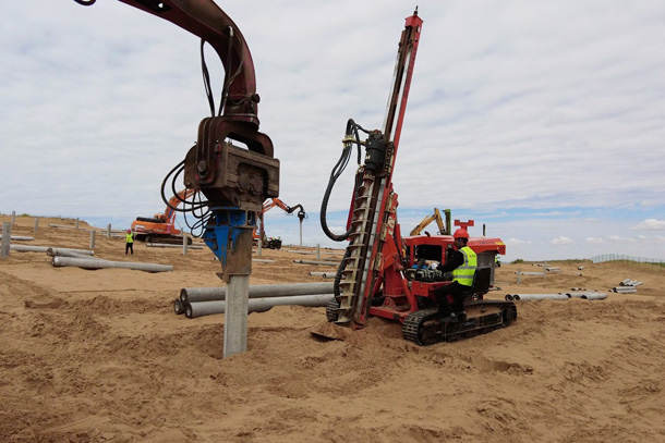 在極端環(huán)境中建設(shè)超級工程,挑戰(zhàn)無處不在,狂暴風(fēng)沙是首要敵人。項(xiàng)目團(tuán)隊(duì)以科技為盾—引入“草方格”、沙障等固沙技術(shù),緊緊鎖住流沙;優(yōu)化支架設(shè)計(jì),增強(qiáng)其抗風(fēng)蝕能力;建立嚴(yán)密風(fēng)沙預(yù)警機(jī)制,與自然巧妙周旋。水資源匱乏是另一道難關(guān)。團(tuán)隊(duì)創(chuàng)新應(yīng)用側(cè)引孔樁基礎(chǔ)施工技術(shù)代替注水引孔,大幅減少施工用水;建設(shè)集雨節(jié)水灌溉系統(tǒng),精準(zhǔn)滴灌,將每一滴水的價(jià)值發(fā)揮到極致。項(xiàng)目經(jīng)理李超翔說:“我們與風(fēng)沙‘斗智’,與干旱‘較勁’,在極限條件下鍛造精品工程?!?/p>