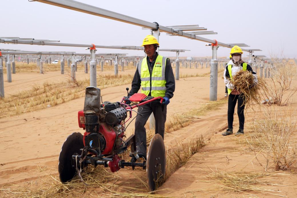 基地的綠色動能正轉(zhuǎn)化為實(shí)實(shí)在在的民生紅利。項(xiàng)目建設(shè)運(yùn)營直接創(chuàng)造了大量就業(yè)崗位,吸引當(dāng)?shù)剞r(nóng)牧民轉(zhuǎn)型為現(xiàn)代產(chǎn)業(yè)工人。從運(yùn)輸?shù)焦こ探ㄔO(shè),從草方格鋪設(shè)到沙生植物種植,無處不有當(dāng)?shù)鼐用竦纳碛?。“?xiàng)目建設(shè)高峰期,有5000人同時(shí)建設(shè)。”李超翔回憶。基地還與周邊村鎮(zhèn)建立緊密幫扶機(jī)制,定向采購農(nóng)副產(chǎn)品,援建基礎(chǔ)設(shè)施,共享發(fā)展成果。一位參與板下種植的村民笑著說:“現(xiàn)在風(fēng)沙小了,家門口有活干、有錢掙,幸福多了!”