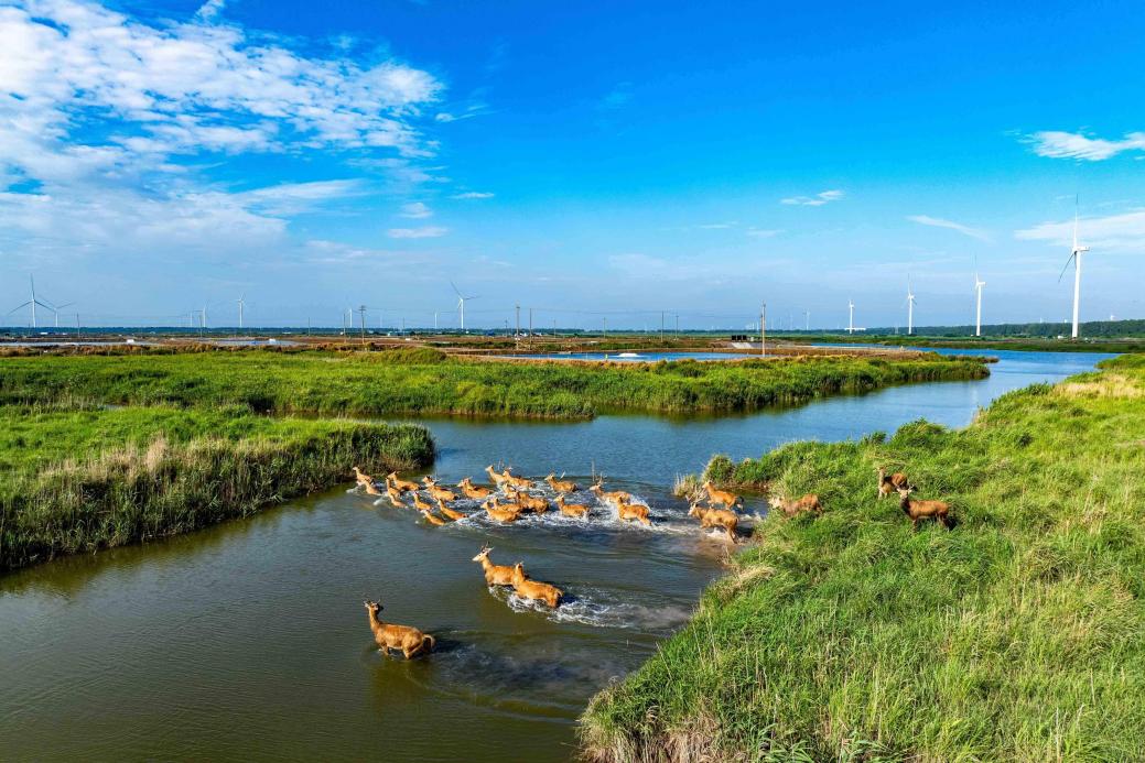 麋鹿踏過弶港風(fēng)電場“風(fēng)機群”。