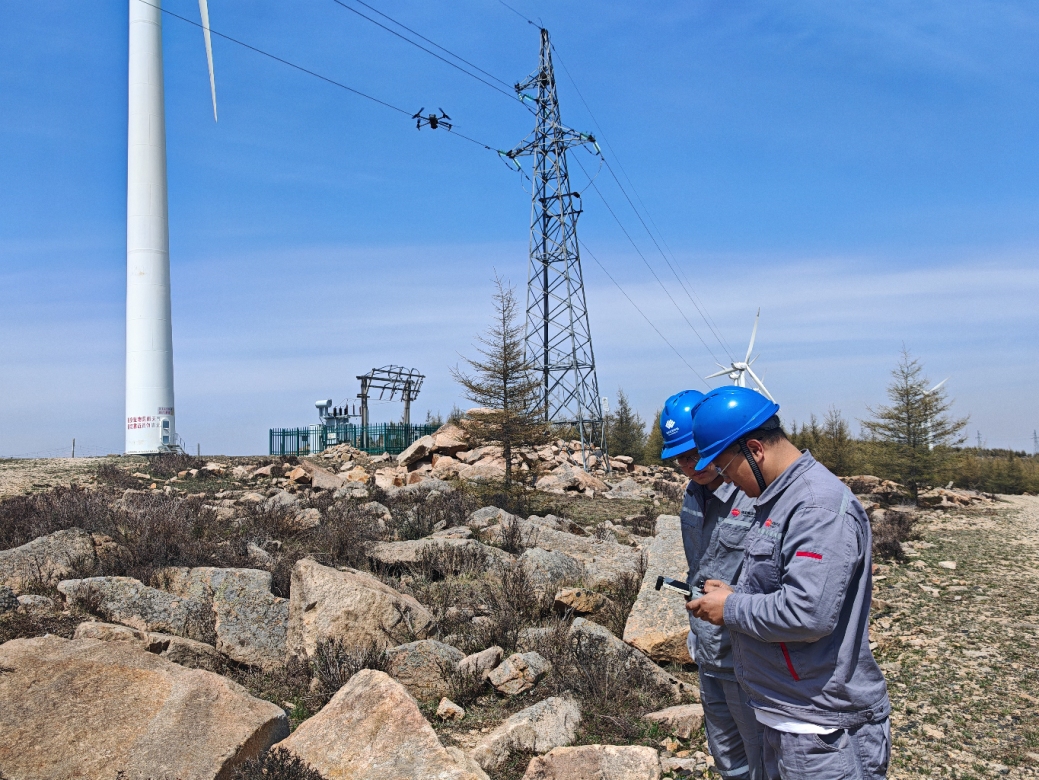 國華投資河北分公司風(fēng)電場員工利用無人機檢查電子圍欄安裝情況。