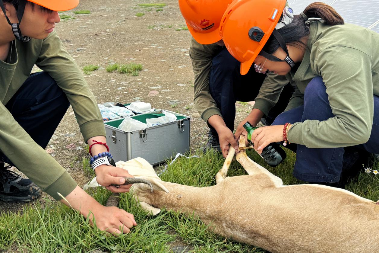 下午,張芮在巡視途中驚喜地發(fā)現“客人”并未走遠,它趴在場區(qū)圍欄的拐角處,試圖站起身來,可是嘗試了幾次都沒能成功。張芮慢慢靠近,才發(fā)現它兩條前腿都有不同程度的撕裂傷,傷口處還有鮮血滲出,染紅了周圍的皮毛。張芮立刻撥通了中控室的電話:“同志們,快來二期東北角的圍欄處,‘黃羊’在這里,記得帶上藥箱,要快,要快!”