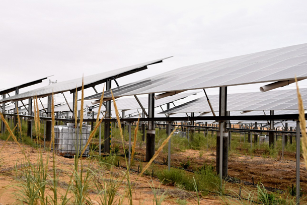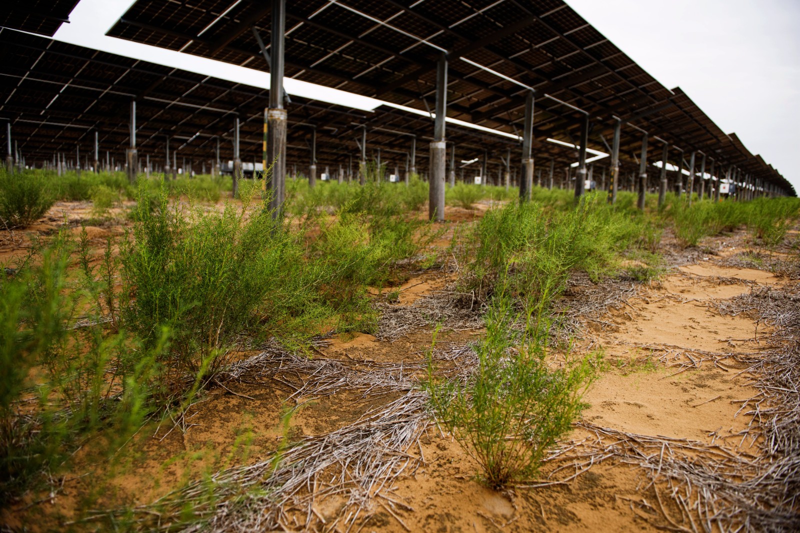 在自然條件下,沙漠生物土壤結皮的形成需要10個年頭。在基地建設者反復試驗與努力下,這一過程被縮短到了3年。如今,基地已建成500畝實證基地,圍繞固沙植物空間配置、沙土改良、“集雨+儲水+根際滴灌”高效用水、人工生物土壤結皮固沙等技術開展試驗,逐步構建起“沙漠光伏+生態(tài)修復+沙產業(yè)”深度融合的發(fā)展模式。