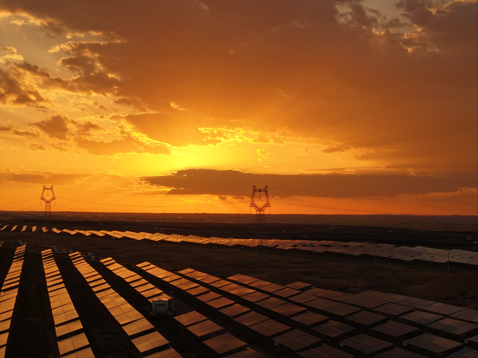 雨后的晚霞中,騰格里沙漠的光伏陣列金光閃閃,板下沙生植物舒展枝葉,沙面被生物結皮緊緊包裹著。在這片曾經沉寂的土地上,正上演著新時代能源開發(fā)與生態(tài)保護同頻共振的國能故事。