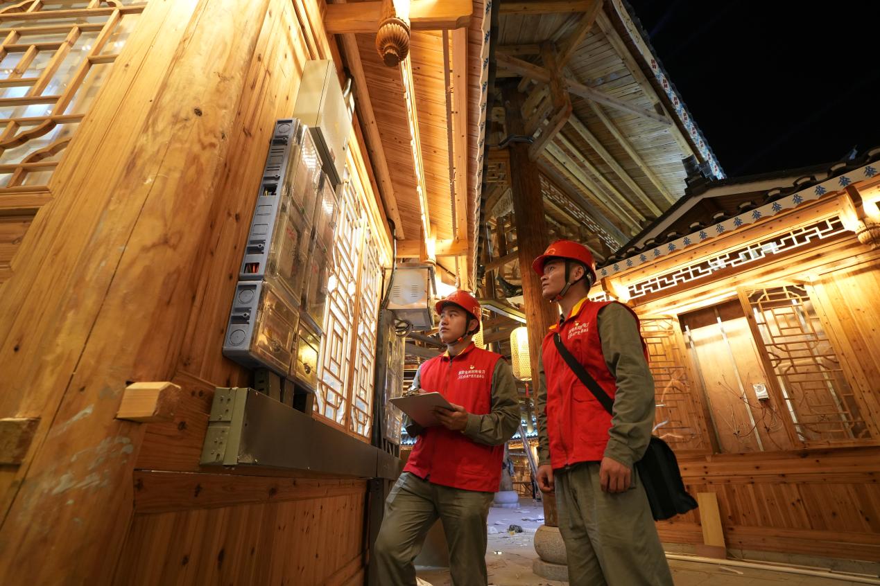國網(wǎng)湖南電力(東方紅)共產(chǎn)黨員服務(wù)隊(duì)在懷化五溪非遺園巡視線路。