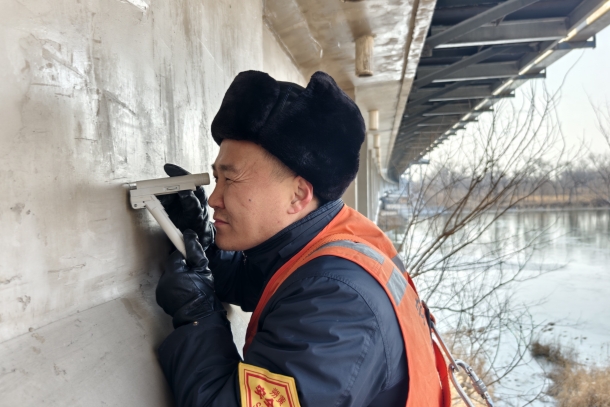 劉海霖和侯桂興分頭檢查,他們逐一復(fù)核螺栓,扳手一扣一松,確認(rèn)緊固狀態(tài)。對伸縮裝置邊緣結(jié)冰的部位,他們先清理再檢查。看到混凝土表面有疑似裂縫處,他們就用刻度放大鏡貼上去一點(diǎn)點(diǎn)比對,把寬度、走向、變化趨勢都要記錄清楚。