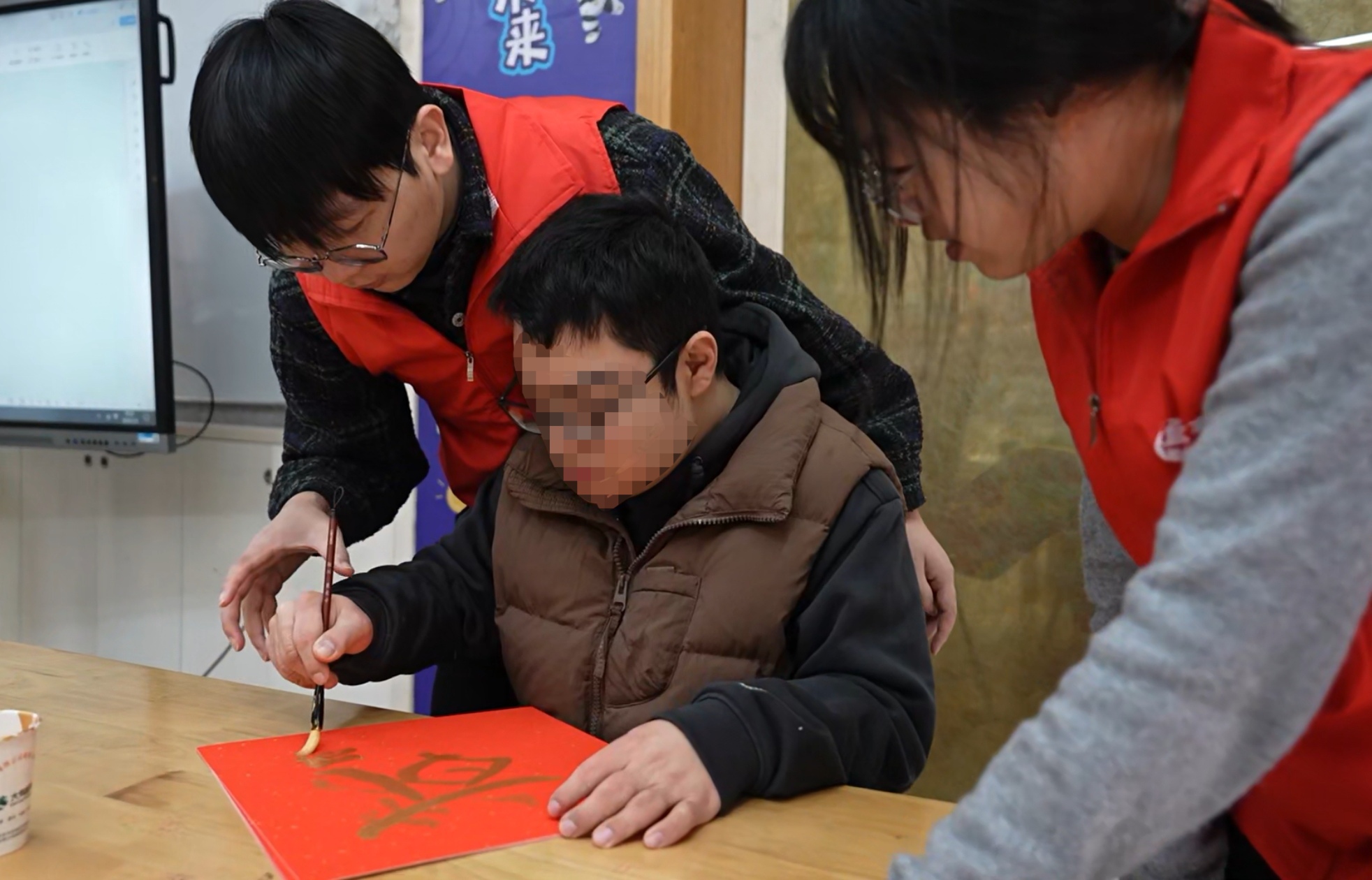 活動過程中,志愿者們始終陪伴在孩子們身邊,認真傾聽他們的聲音,分享他們的喜悅。寫“?!弊?/span>、展示作品、合影留念……歡聲笑語充滿了整個教室,孩子們的臉上綻放出燦爛的笑容。