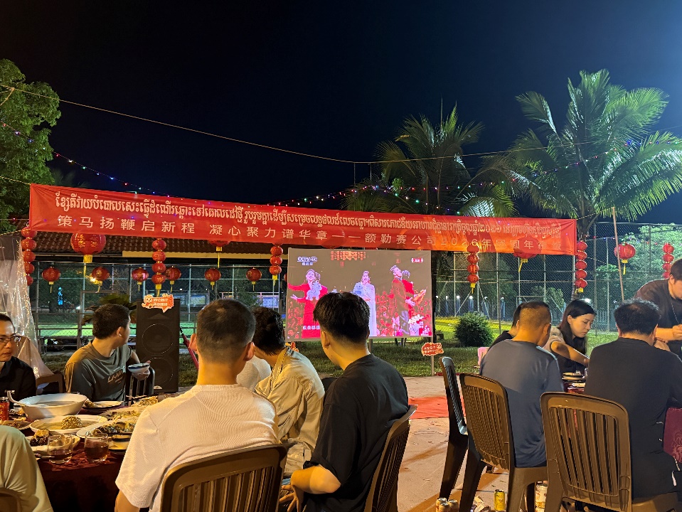 項(xiàng)目營(yíng)地張燈結(jié)彩,火紅的燈籠和喜慶的彩燈高高掛起,處處充滿著喜慶的節(jié)日氣氛。公司為中柬員工準(zhǔn)備了豐盛的年夜飯。大家歡聚一堂,圍坐在桌旁,品嘗著兼具中柬特色的美食,歡聲笑語(yǔ)不絕于耳,濃濃“家”的味道驅(qū)散了身在異鄉(xiāng)的孤單。中柬員工一同收看中國(guó)中央電視臺(tái)春節(jié)聯(lián)歡晚會(huì),共同感受著中華文化的獨(dú)特魅力,時(shí)而為幽默的小品開(kāi)懷大笑,時(shí)而為美妙的歌聲鼓掌喝彩。隨后的KTV環(huán)節(jié),將氣氛推向高潮,現(xiàn)場(chǎng)成為一片歡樂(lè)的海洋。