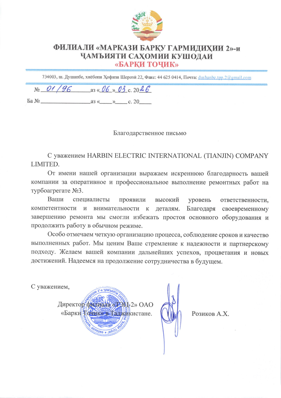 此次緊急搶修的快速響應(yīng)與高質(zhì)量處置,受到塔吉克斯坦官方的高度評價與充分肯定。塔吉克斯坦副總理對哈電國際在關(guān)鍵時刻挺身而出的責(zé)任擔(dān)當(dāng)、高效專業(yè)的技術(shù)能力給予高度贊譽;塔吉克斯坦電力部專門發(fā)來感謝信,對哈電國際搶修團隊不畏艱難、全力以赴、精益求精的工作作風(fēng)表示誠摯感謝,高度認可公司為當(dāng)?shù)仉娏Π踩U献鞒龅闹匾暙I。