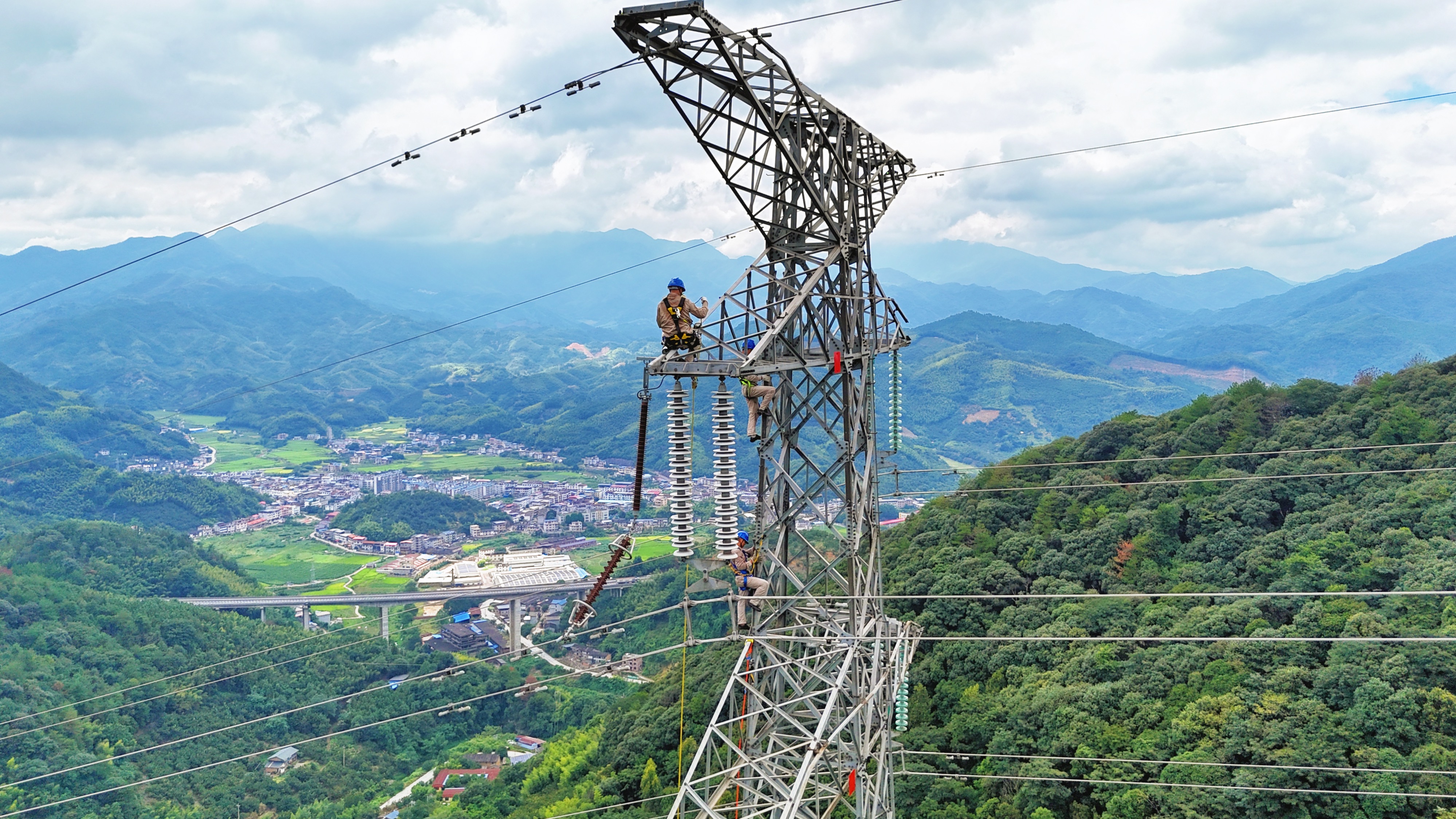 國網(wǎng)三明供電公司輸電運檢中心工作人員在220千伏興良線#77號塔更換避雷器槽鋼。(詹雪慧 攝)