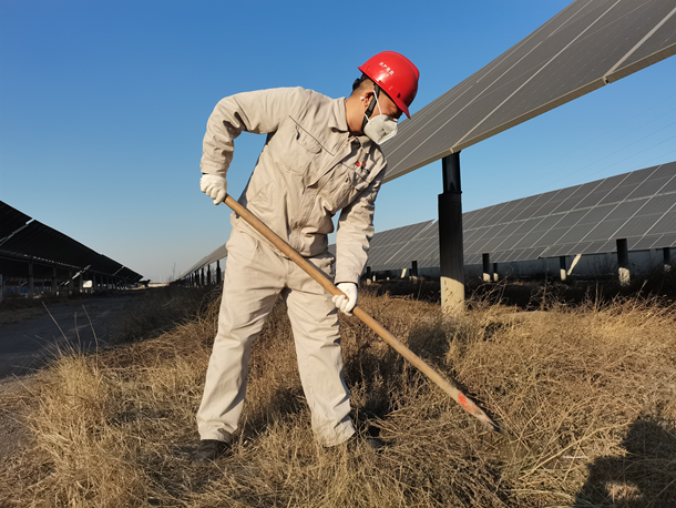 圖為檢修人員正在清理光伏板下枯草。