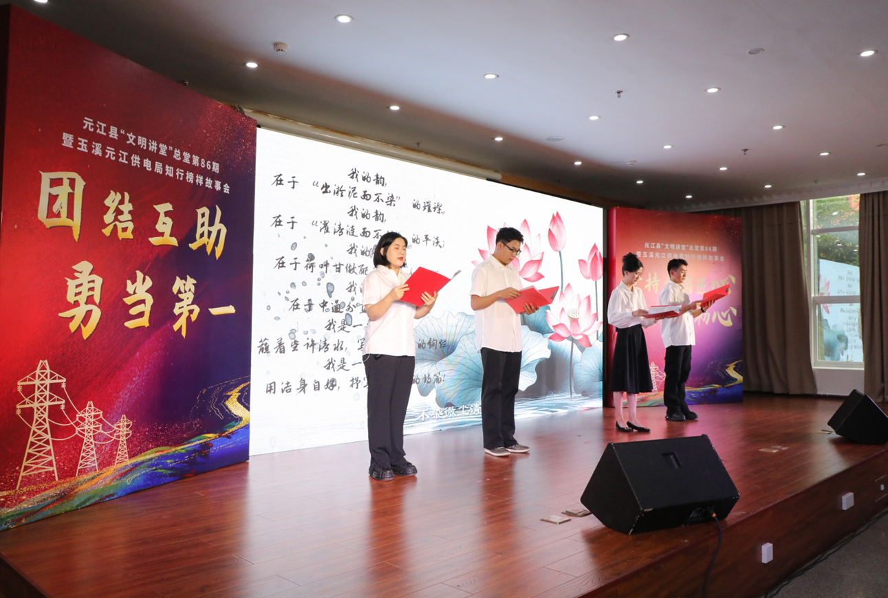 活動(dòng)現(xiàn)場(chǎng),縣屬各文明單位干部職工及南網(wǎng)元江供電的干部員工齊聚一堂,通過(guò)看視頻、誦經(jīng)典、講故事、拜師禮、唱歌曲、誦經(jīng)典、舞臺(tái)劇、骨干宣講、合唱九個(gè)環(huán)節(jié)組成,營(yíng)造了團(tuán)結(jié)奮進(jìn)、昂揚(yáng)向上的濃厚氛圍。