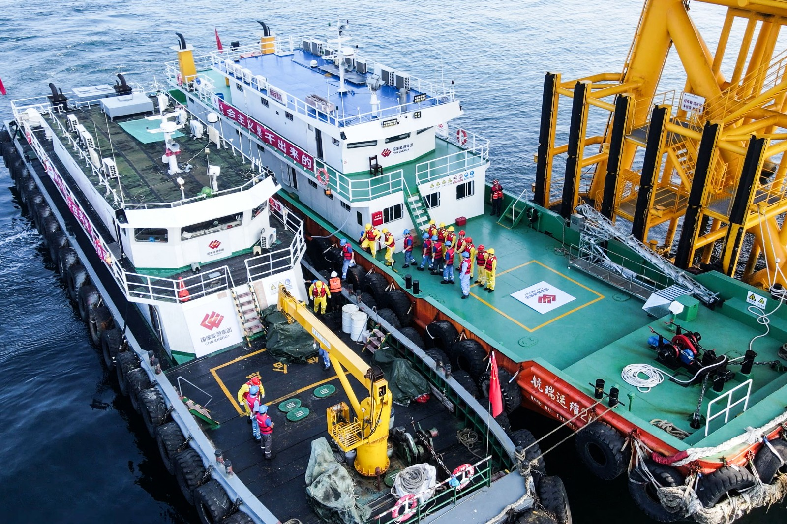 演習(xí)圍繞“海上風(fēng)電場船舶及人員撤離”“落水人員搜尋與救助”“船舶消防滅火”“溢油圍控與回收”四大科目依次展開,共調(diào)動包括海事巡邏船、專業(yè)救助船、拖輪、清污船、無人艇在內(nèi)的多型船舶及救助直升機、監(jiān)測無人機,實現(xiàn)了海陸空立體協(xié)同作戰(zhàn)。演習(xí)背景設(shè)定為寒潮大風(fēng)過境青島海域,國家能源集團國華投資山東分公司決定對望海風(fēng)電場30余名人員進行撤離,在撤離過程中,“耀陽588”輪發(fā)生3人落水險情,同時“潤航118”輪與升壓站發(fā)生碰撞引發(fā)火災(zāi)和燃油泄漏。其中,在“人員撤離”科目中,1艘運維船舶靠近望海風(fēng)電場升壓站,30名作業(yè)人員井然有序撤離,展現(xiàn)了該風(fēng)電場應(yīng)對極端天氣下優(yōu)秀的組織調(diào)度能力。