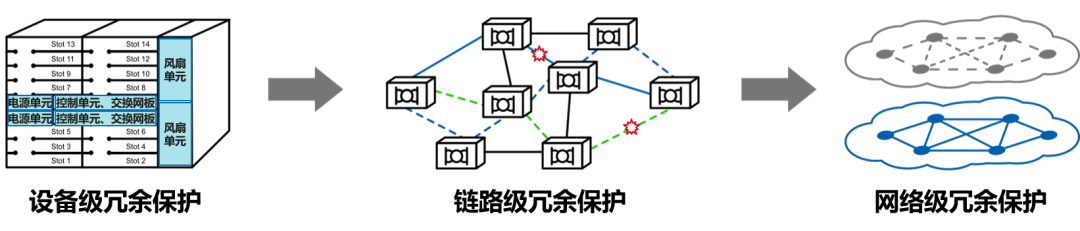 第一道防線是采用高可靠的通信技術(shù),如NHP(Native Hard Pipe,原生硬管道)網(wǎng)絡(luò),同時(shí)通信設(shè)備的關(guān)鍵部件采用冗余保護(hù)設(shè)計(jì)。當(dāng)系統(tǒng)監(jiān)測到電源、風(fēng)扇、交換網(wǎng)板等器件異常時(shí),冗余保護(hù)設(shè)計(jì)可立刻切換至備用器件,保證設(shè)備正常運(yùn)行。