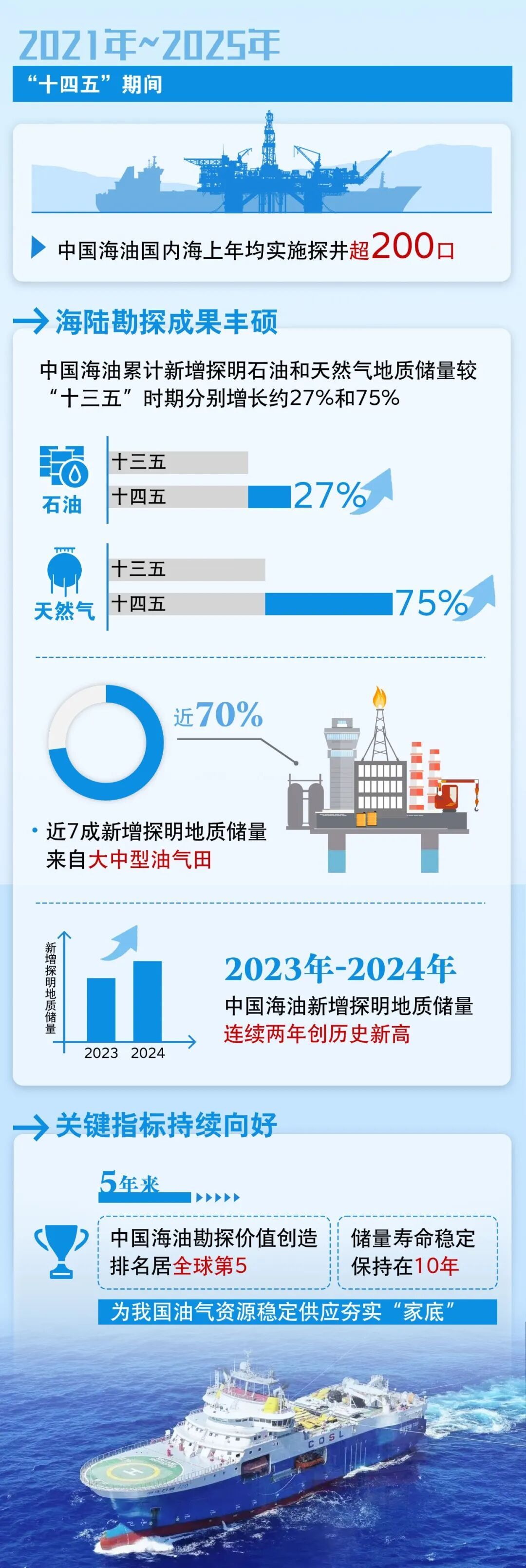 中國海油在“四個革命、一個合作”能源安全新戰(zhàn)略指引下,堅持大中型油氣田勘探思路,預(yù)計“十四五”期間,累計新增探明石油和天然氣地質(zhì)儲量較“十三五”時期分別增長約27%和75%,其中近7成新增探明地質(zhì)儲量來自大中型油氣田,先后發(fā)現(xiàn)了多個億噸級油田和千億方氣田,為提高我國能源自給率、保障國家能源安全奠定重要資源基礎(chǔ)。