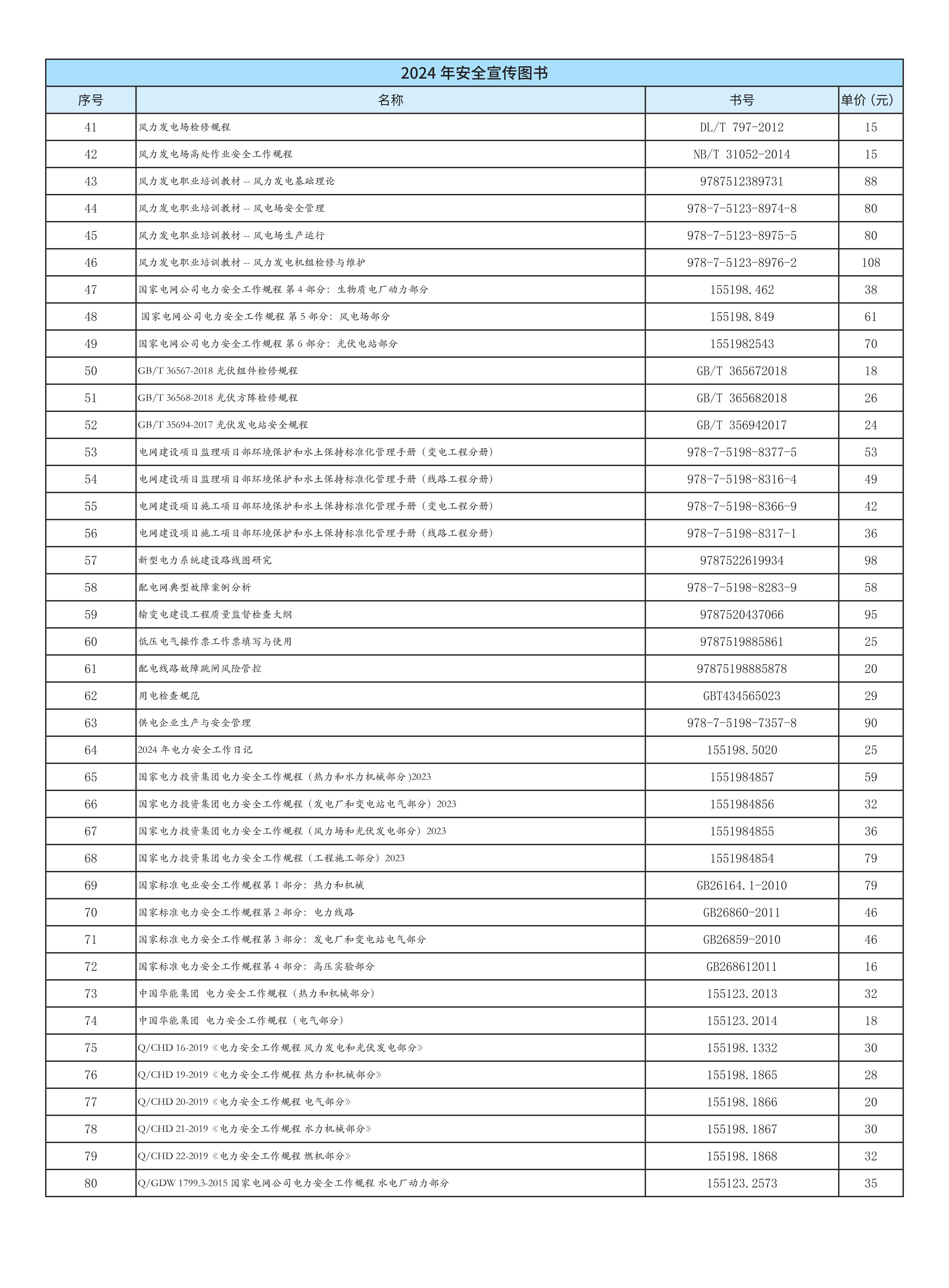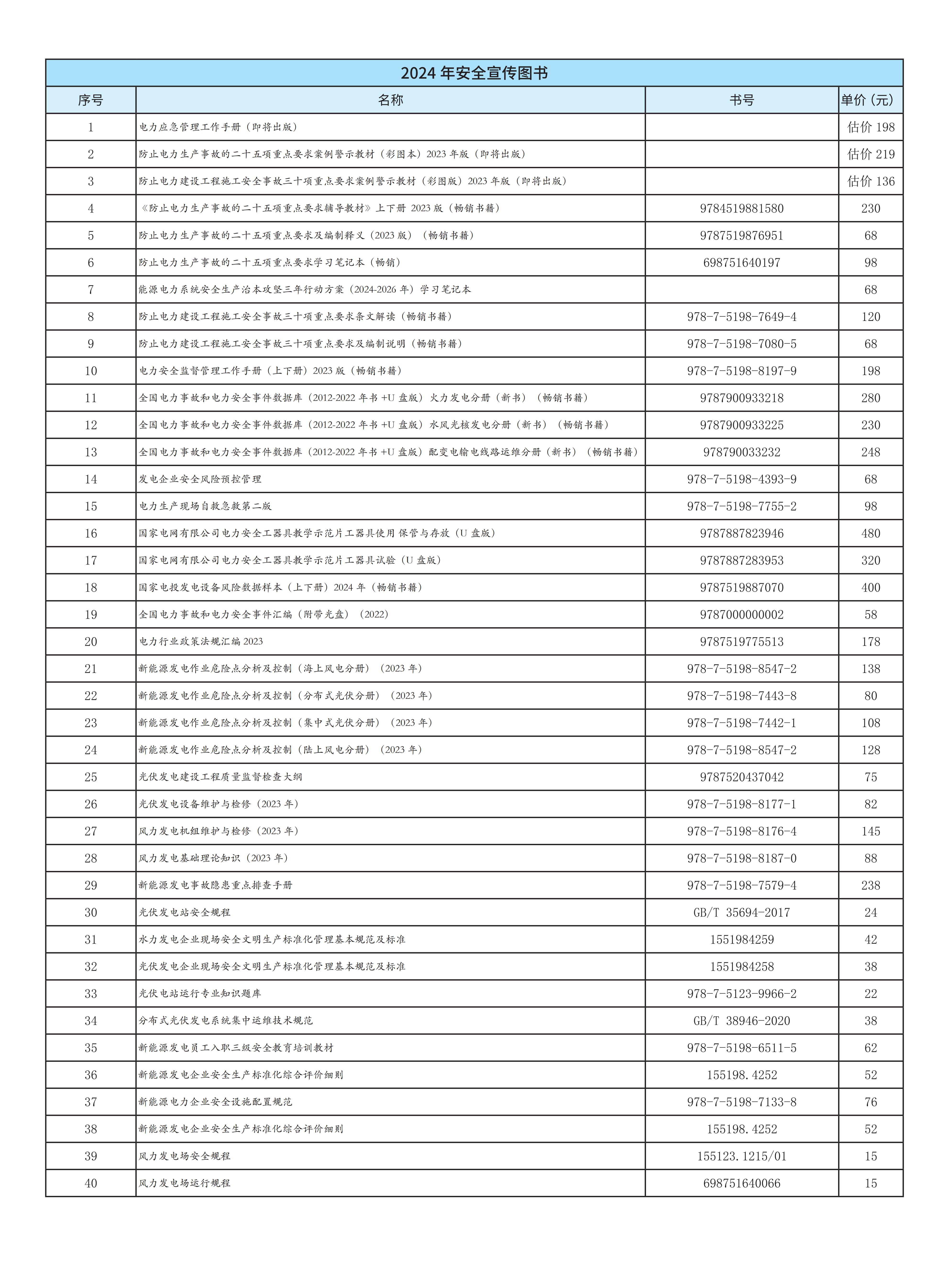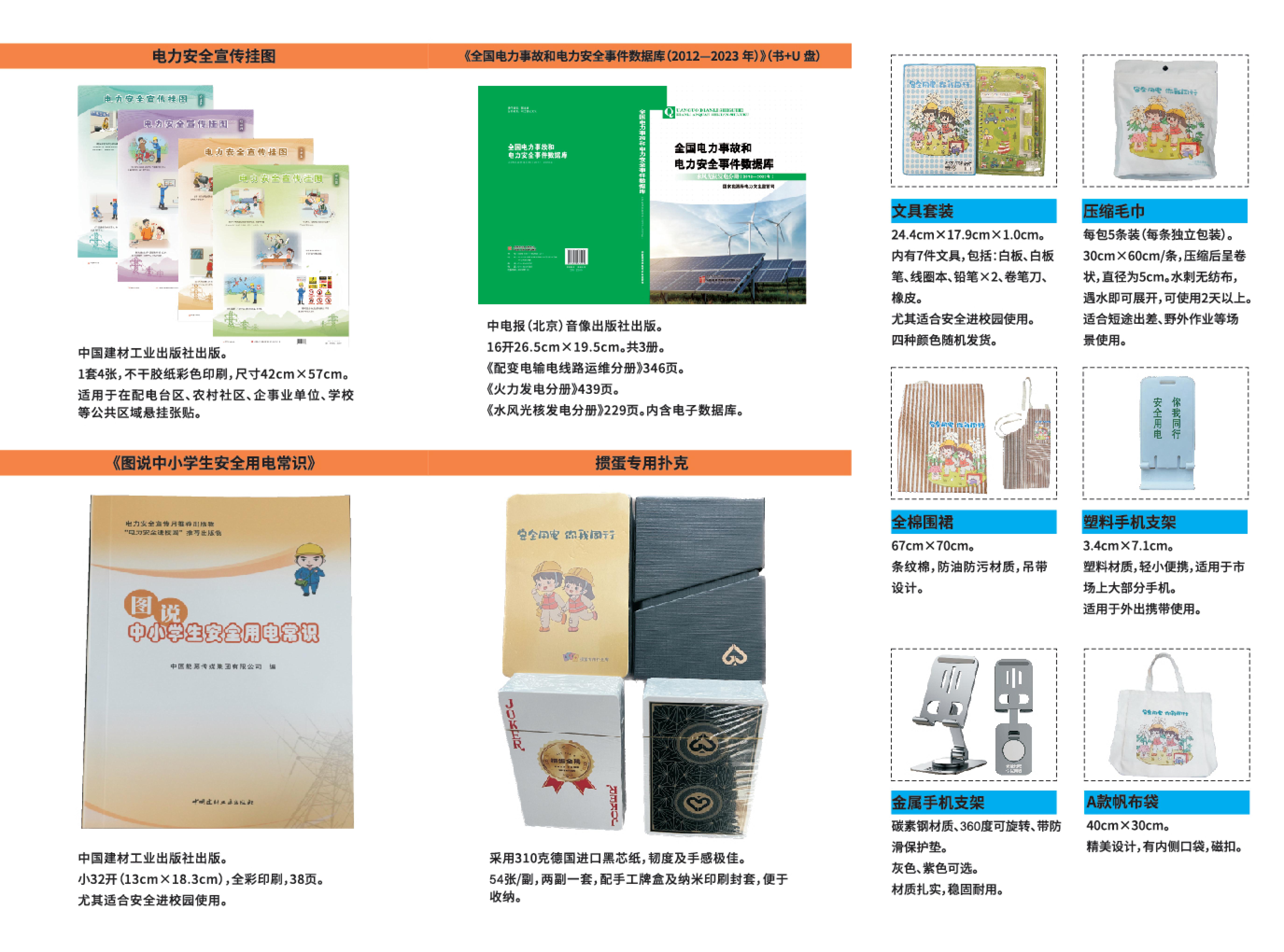為支持各單位開展2024年電力行業(yè)“安全生產(chǎn)月”活動,現(xiàn)推出2024年電力行業(yè)“安全生產(chǎn)月”活動系列宣教產(chǎn)品,包括折頁、圖書、畫冊、視頻片、文創(chuàng)、設(shè)備等,歡迎各單位訂購。咨詢電話010-63414947、13581877982。