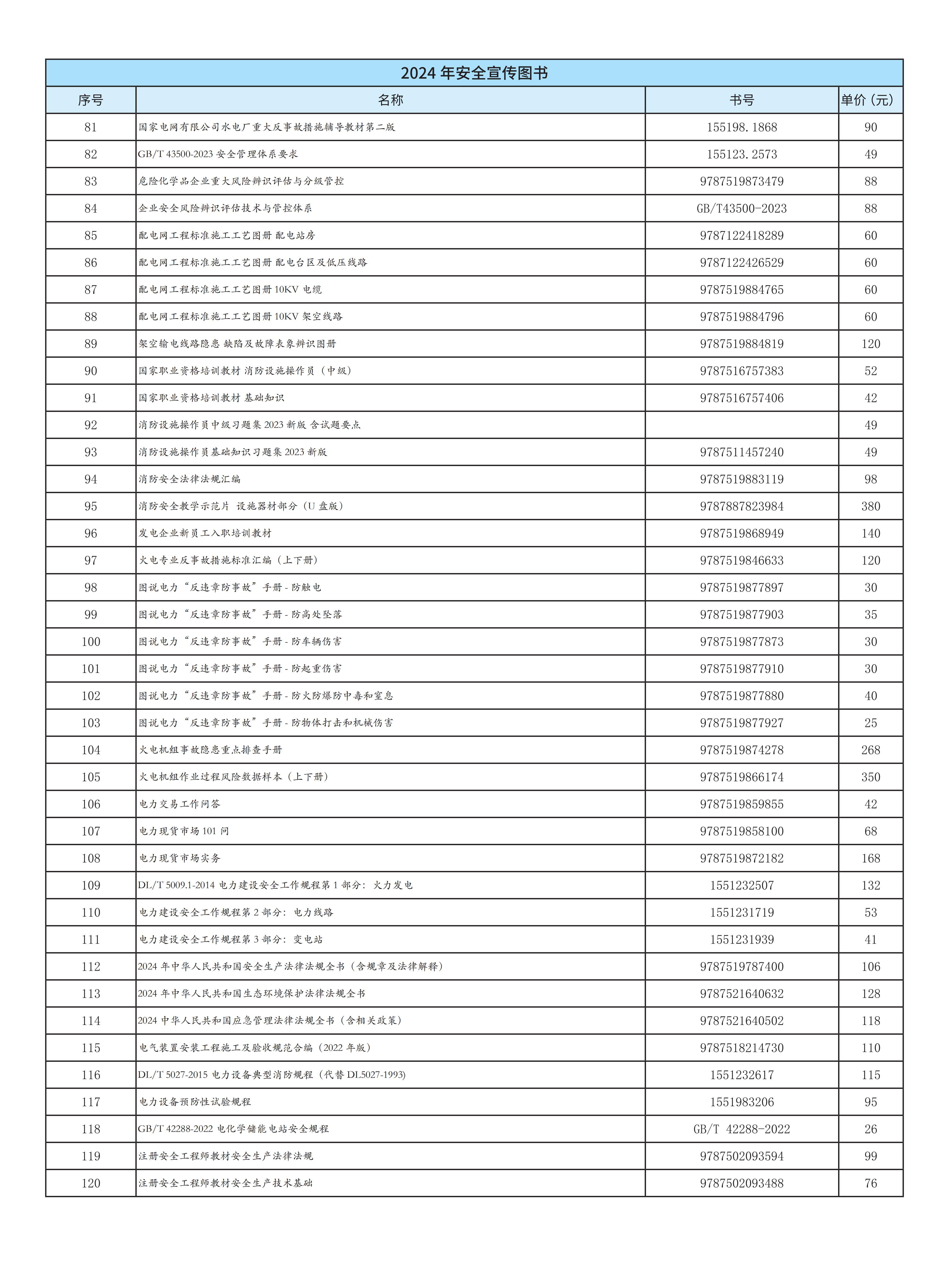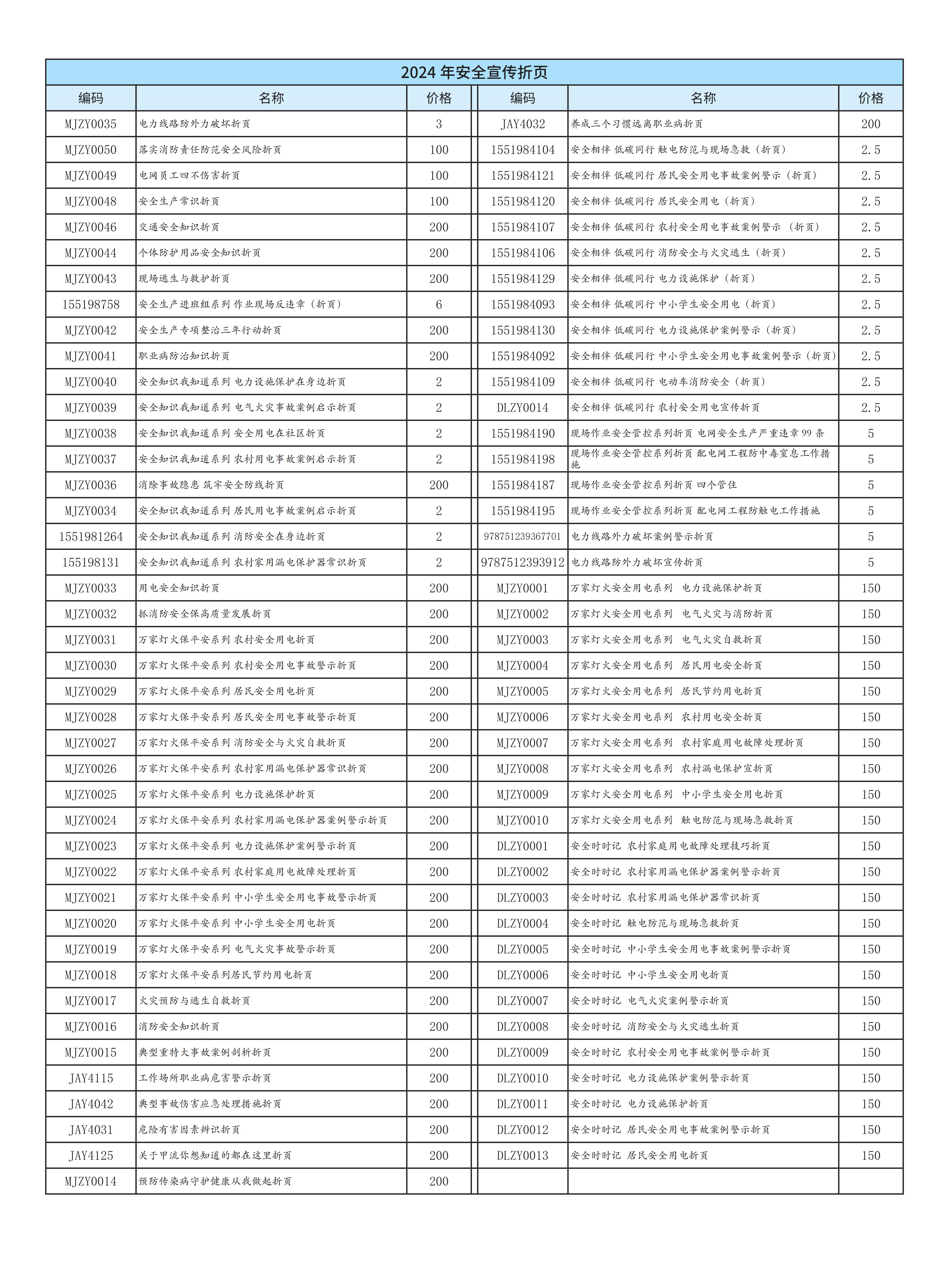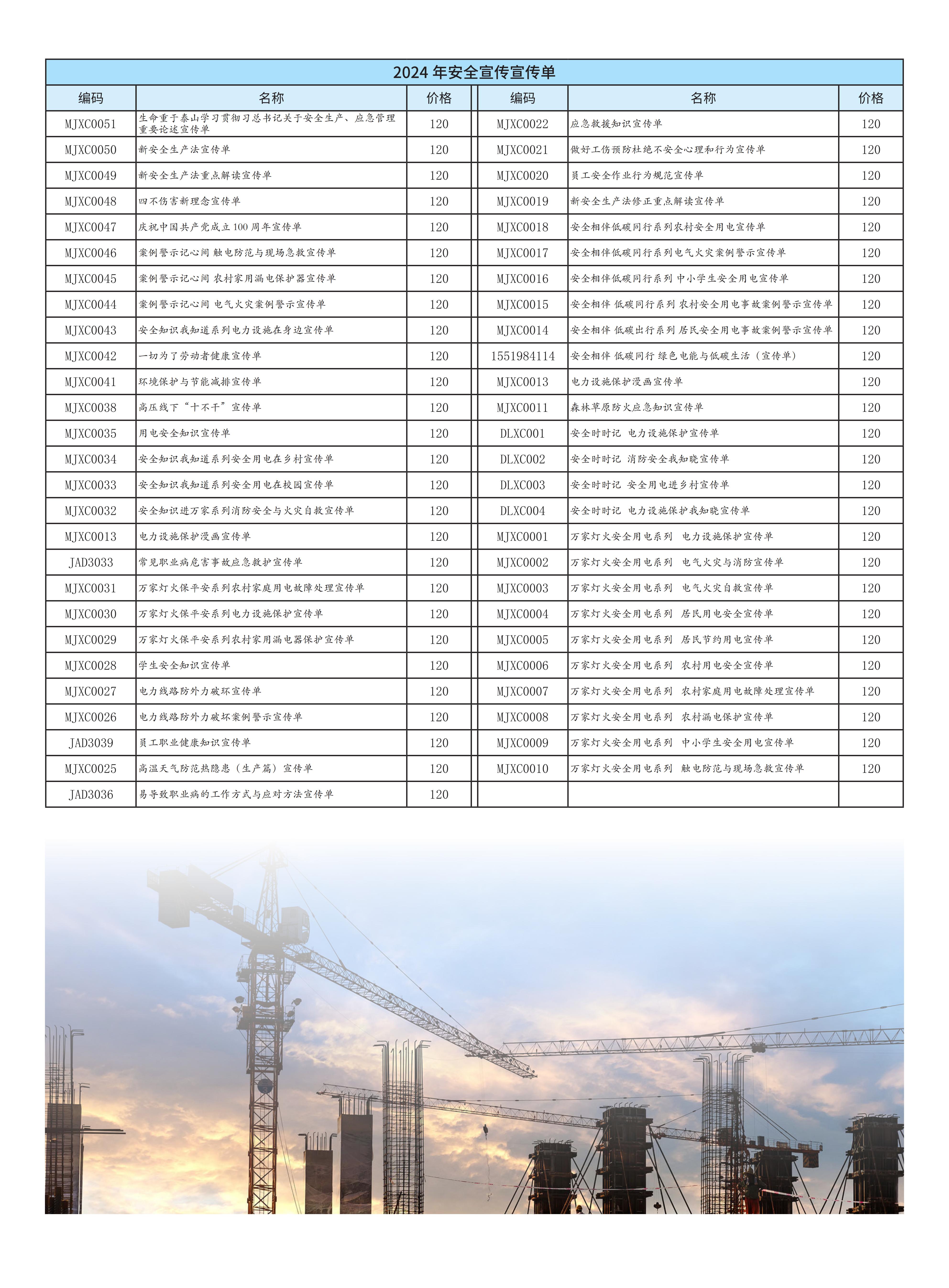 為支持各單位開展2024年電力行業(yè)“安全生產(chǎn)月”活動,現(xiàn)推出2024年電力行業(yè)“安全生產(chǎn)月”活動系列宣教產(chǎn)品,包括折頁、圖書、畫冊、視頻片、文創(chuàng)、設(shè)備等,歡迎各單位訂購。咨詢電話010-63414947、13581877982。