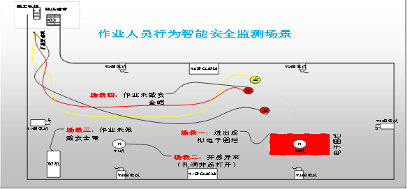 ?。?)電子圍欄監(jiān)測(cè):在監(jiān)管區(qū)域內(nèi),值班人員可對(duì)重點(diǎn)設(shè)備(如:主變、配電室、檢修區(qū)域、主要輔機(jī)等)、重點(diǎn)作業(yè)區(qū)域設(shè)置虛擬電子圍欄,當(dāng)人員靠近設(shè)置的預(yù)警距離或穿越“電子圍欄”坐標(biāo)邊際時(shí),視頻智能分析應(yīng)用服務(wù)實(shí)時(shí)推送預(yù)警或告警信息在“三維模型”顯示“人員靠近或穿越電子圍欄”預(yù)警或告警信息。三維模型應(yīng)用服務(wù)在監(jiān)控中心大屏“視頻區(qū)域”聯(lián)動(dòng)視頻監(jiān)控設(shè)備,實(shí)時(shí)預(yù)覽預(yù)警或告警區(qū)域?qū)崨r,以“消息”通知推送給值班人員或安全管理人員。