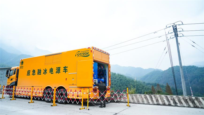 國網(wǎng)浙江電力員工利用應(yīng)急融冰電源車開展融冰工作。